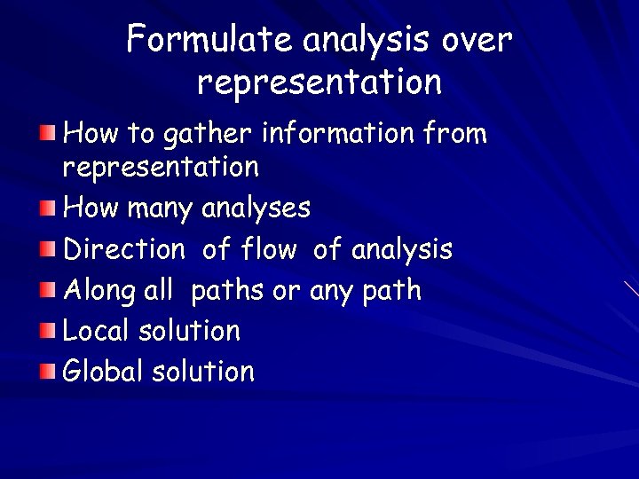 Formulate analysis over representation How to gather information from representation How many analyses Direction of flow of analysis Along all paths or any path Local solution Global solution