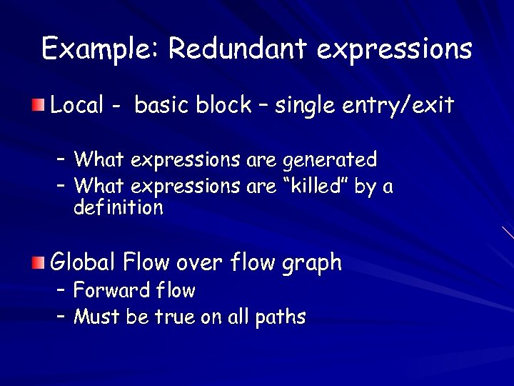 Example: Redundant expressions Local - basic block – single entry/exit – What expressions are generated – What expressions are “killed” by a definition Global Flow over flow graph – Forward flow – Must be true on all paths