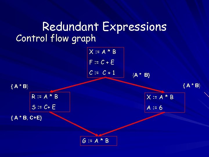 Redundant Expressions Control flow graph X : = A * B F : = C + E C : = C + 1 {A * B} { A * B} R : = A * B X : = A * B S : = C+ E A : = 6 { A * B, C+E} G : = A * B