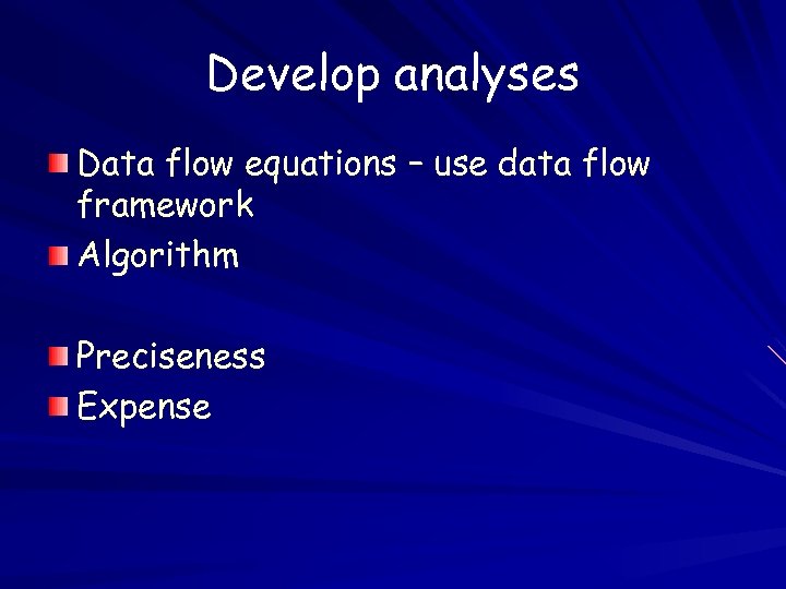 Develop analyses Data flow equations – use data flow framework Algorithm Preciseness Expense