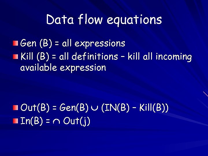 Data flow equations Gen (B) = all expressions Kill (B) = all definitions – kill all incoming available expression Out(B) = Gen(B) (IN(B) – Kill(B)) In(B) = Out(j)