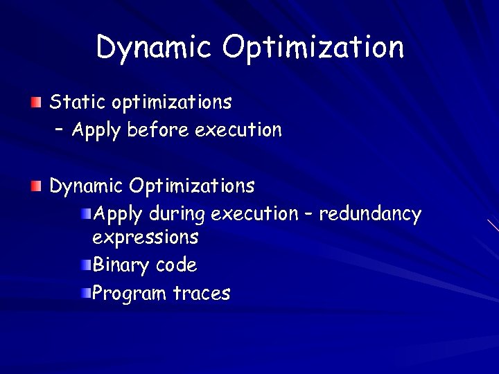 Dynamic Optimization Static optimizations – Apply before execution Dynamic Optimizations Apply during execution – redundancy expressions Binary code Program traces