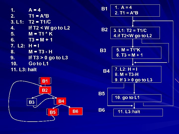 B 1 1. A = 4 2. T 1 = A*B B 2 1. A=4 2. T 1 = A*B 3. L 1: T 2 = T 1/C 4. If T 2 < W go to L 2 5. M = T 1 * K 6. T 3 = M + 1 7. L 2: H = I 8. M = T 3 - H 9. If T 3 > 0 go to L 3 10. Go to L 1 11. L 3: halt 3. L 1: T 2 = T 1/C 4. if T 2<W go to L 2 B 3 B 4 B 1 B 2 B 5 B 4 B 3 B 5 B 6 5. M = T 1*K 6. T 3 = M + 1 7. L 2: H = I 8. M = T 3 -H 9. If 3 > 0 go to L 3 10. go to L 1 11. L 3: halt