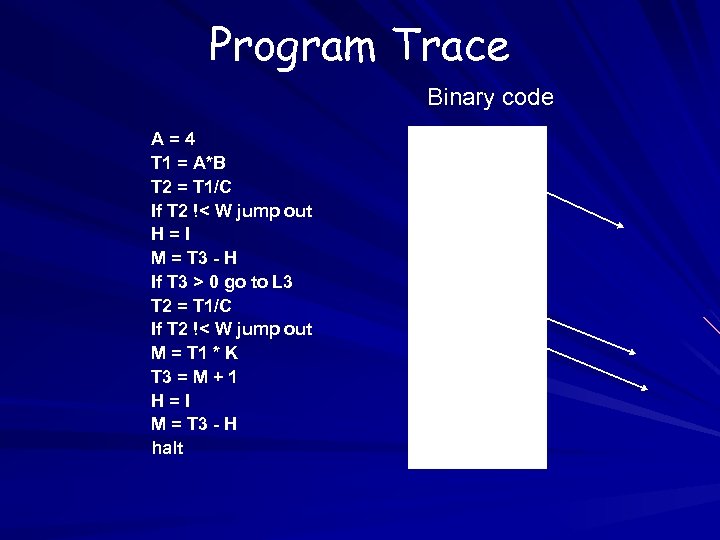 Program Trace Binary code A=4 T 1 = A*B T 2 = T 1/C If T 2 !< W jump out H=I M = T 3 - H If T 3 > 0 go to L 3 T 2 = T 1/C If T 2 !< W jump out M = T 1 * K T 3 = M + 1 H=I M = T 3 - H halt