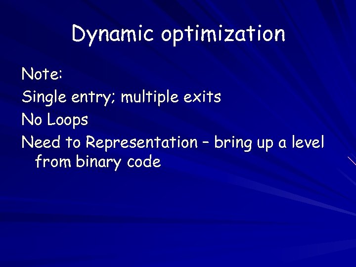 Dynamic optimization Note: Single entry; multiple exits No Loops Need to Representation – bring up a level from binary code