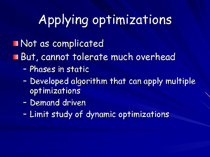 Applying optimizations Not as complicated But, cannot tolerate much overhead – Phases in static – Developed algorithm that can apply multiple optimizations – Demand driven – Limit study of dynamic optimizations