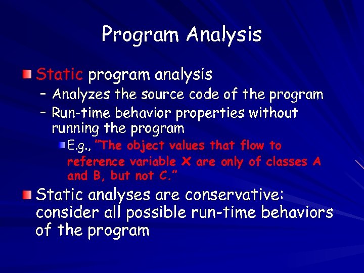 Program Analysis Static program analysis – Analyzes the source code of the program – Run-time behavior properties without running the program E. g. , ”The object values that flow to reference variable x are only of classes A and B, but not C. ” Static analyses are conservative: consider all possible run-time behaviors of the program