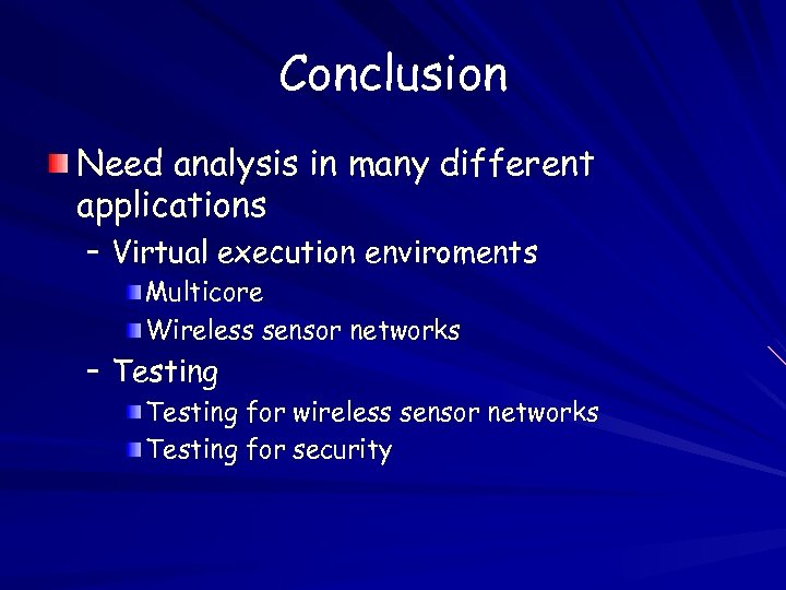Conclusion Need analysis in many different applications – Virtual execution enviroments Multicore Wireless sensor networks – Testing for wireless sensor networks Testing for security