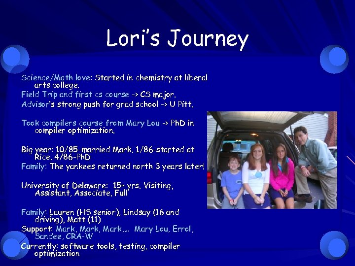 Lori’s Journey Science/Math love: Started in chemistry at liberal arts college. Field Trip and first cs course -> CS major. Advisor’s strong push for grad school -> U Pitt. Took compilers course from Mary Lou -> Ph. D in compiler optimization. Big year: 10/85 -married Mark. 1/86 -started at Rice. 4/86 -Ph. D Family: The yankees returned north 3 years later! University of Delaware: 15+ yrs. Visiting, Assistant, Associate, Full Family: Lauren (HS senior), Lindsay (16 and driving), Matt (11) Support: Mark, … Mary Lou, Errol, Sandee, CRA-W Currently: software tools, testing, compiler optimization