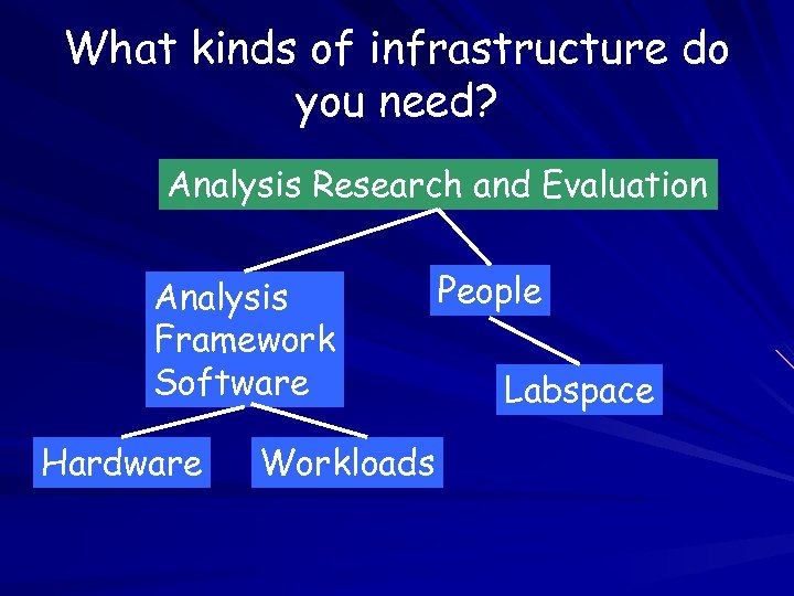 What kinds of infrastructure do you need? Analysis Research and Evaluation Analysis Framework Software Hardware Workloads People Labspace