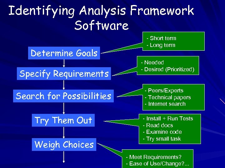 Identifying Analysis Framework Software Determine Goals Specify Requirements - Short term - Long term - Needed - Desired (Prioritized) Search for Possibilities - Peers/Experts - Technical papers - Internet search Try Them Out - Install + Run Tests - Read docs - Examine code - Try small task Weigh Choices - Meet Requirements? - Ease of Use/Change? . . .