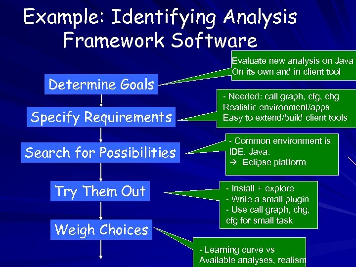 Example: Identifying Analysis Framework Software Determine Goals Specify Requirements Search for Possibilities Try Them Out Weigh Choices Evaluate new analysis on Java On its own and in client tool - Needed: call graph, cfg, chg Realistic environment/apps Easy to extend/build client tools - Common environment is IDE, Java. Eclipse platform - Install + explore - Write a small plugin - Use call graph, chg, cfg for small task - Learning curve vs Available analyses, realism