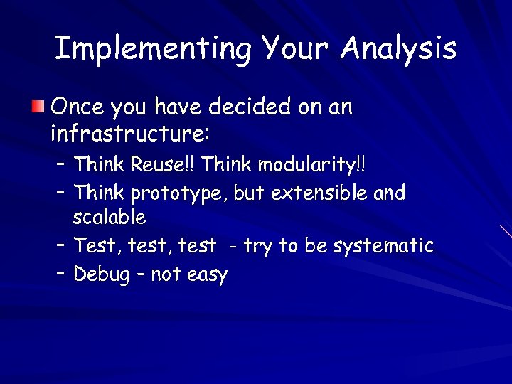 Implementing Your Analysis Once you have decided on an infrastructure: – Think Reuse!! Think modularity!! – Think prototype, but extensible and scalable – Test, test - try to be systematic – Debug – not easy