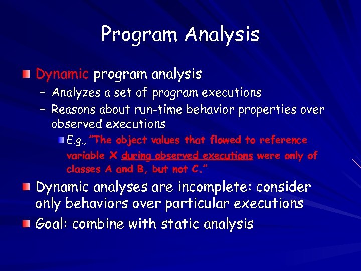 Program Analysis Dynamic program analysis – Analyzes a set of program executions – Reasons about run-time behavior properties over observed executions E. g. , ”The object values that flowed to reference variable x during observed executions were only of classes A and B, but not C. ” Dynamic analyses are incomplete: consider only behaviors over particular executions Goal: combine with static analysis