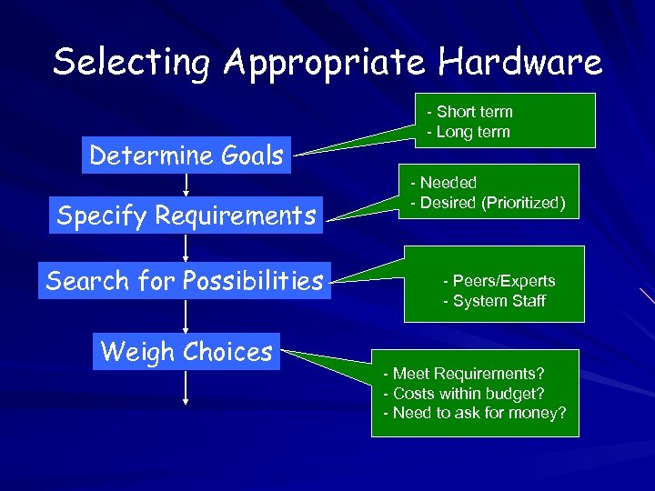 Selecting Appropriate Hardware Determine Goals Specify Requirements Search for Possibilities Weigh Choices - Short term - Long term - Needed - Desired (Prioritized) - Peers/Experts - System Staff - Meet Requirements? - Costs within budget? - Need to ask for money?