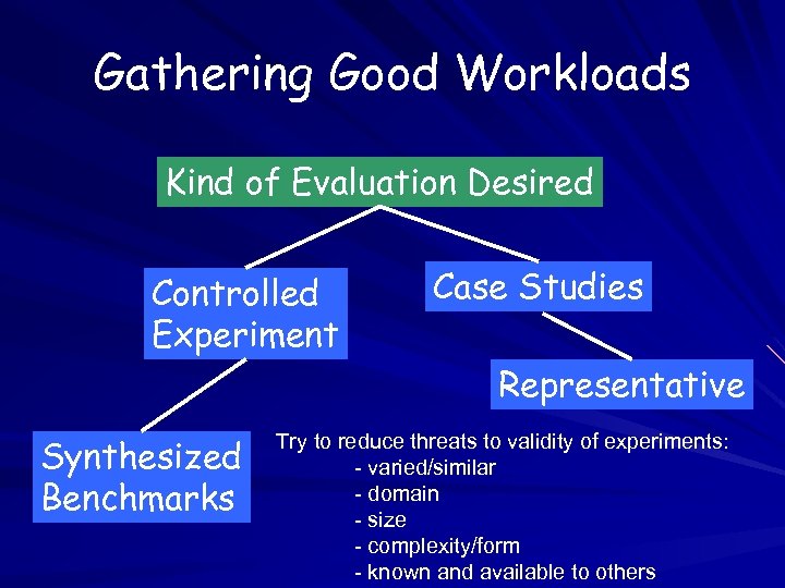 Gathering Good Workloads Kind of Evaluation Desired Controlled Experiment Case Studies Representative Synthesized Benchmarks Try to reduce threats to validity of experiments: - varied/similar - domain - size - complexity/form - known and available to others