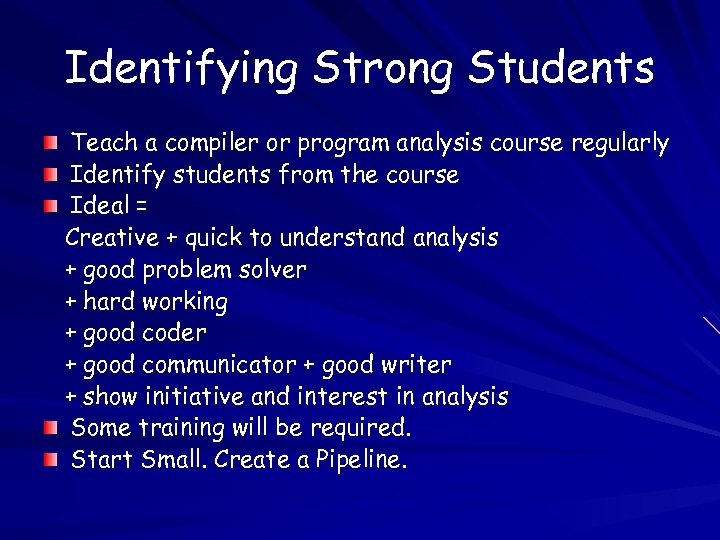 Identifying Strong Students Teach a compiler or program analysis course regularly Identify students from the course Ideal = Creative + quick to understand analysis + good problem solver + hard working + good coder + good communicator + good writer + show initiative and interest in analysis Some training will be required. Start Small. Create a Pipeline.