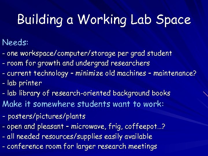 Building a Working Lab Space Needs: - one workspace/computer/storage per grad student - room for growth and undergrad researchers - current technology – minimize old machines – maintenance? - lab printer - lab library of research-oriented background books Make it somewhere students want to work: - posters/pictures/plants - open and pleasant – microwave, frig, coffeepot…? - all needed resources/supplies easily available - conference room for larger research meetings