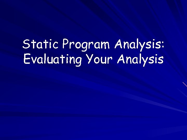 Evaluation of an Analysis for a Software Tool Finding a benchmark set – – – Depends on analysis application Large programs Diverse programs, as many as it is feasible Publicly available: sourceforge. org Look at benchmark suites in published work! Ideally, you will have a large set of diverse programs, will show acceptable absolute precision (low false positive rate) and practical cost