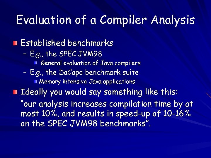 Evaluation of a Compiler Analysis Established benchmarks – E. g. , the SPEC JVM 98 General evaluation of Java compilers – E. g. , the Da. Capo benchmark suite Memory intensive Java applications Ideally you would say something like this: “our analysis increases compilation time by at most 10%, and results in speed-up of 10 -16% on the SPEC JVM 98 benchmarks”.