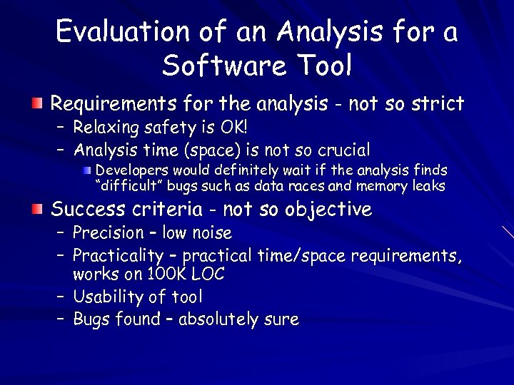 Evaluation of an Analysis for a Software Tool Requirements for the analysis - not so strict – Relaxing safety is OK! – Analysis time (space) is not so crucial Developers would definitely wait if the analysis finds “difficult” bugs such as data races and memory leaks Success criteria - not so objective – Precision – low noise – Practicality – practical time/space requirements, works on 100 K LOC – Usability of tool – Bugs found – absolutely sure