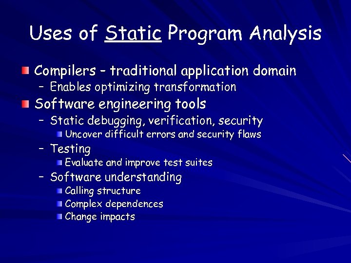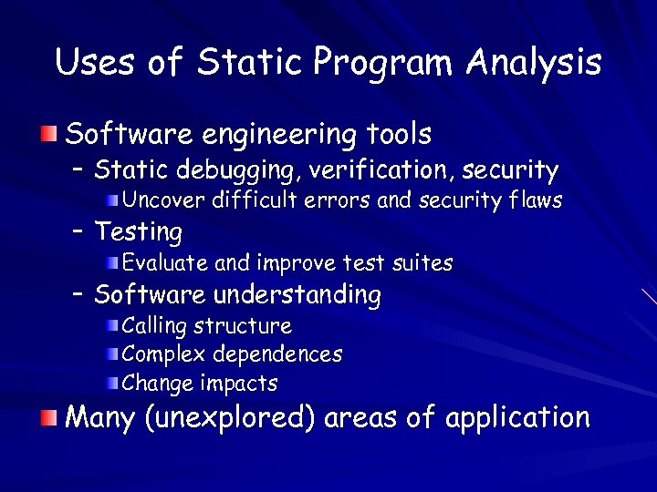 Uses of Static Program Analysis Software engineering tools – Static debugging, verification, security Uncover difficult errors and security flaws – Testing Evaluate and improve test suites – Software understanding Calling structure Complex dependences Change impacts Many (unexplored) areas of application