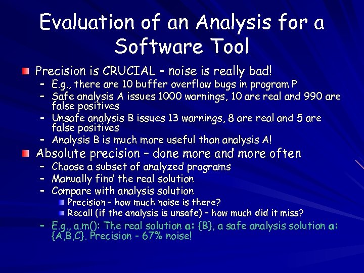 Evaluation of an Analysis for a Software Tool Precision is CRUCIAL – noise is really bad! – E. g. , there are 10 buffer overflow bugs in program P – Safe analysis A issues 1000 warnings, 10 are real and 990 are false positives – Unsafe analysis B issues 13 warnings, 8 are real and 5 are false positives – Analysis B is much more useful than analysis A! Absolute precision – done more and more often – – – Choose a subset of analyzed programs Manually find the real solution Compare with analysis solution Precision – how much noise is there? Recall (if the analysis is unsafe) – how much did it miss? – E. g. , a. m(): The real solution a: {B}, a safe analysis solution a: {A, B, C}. Precision - 67% noise!