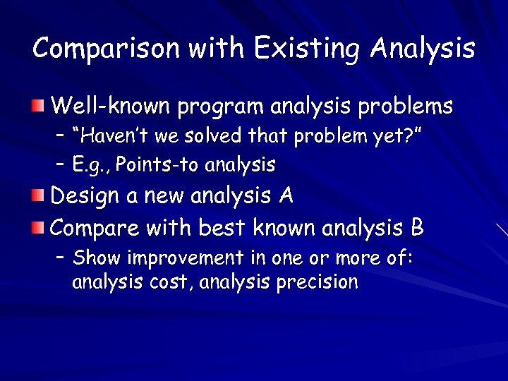 Comparison with Existing Analysis Well-known program analysis problems – “Haven’t we solved that problem yet? ” – E. g. , Points-to analysis Design a new analysis A Compare with best known analysis B – Show improvement in one or more of: analysis cost, analysis precision