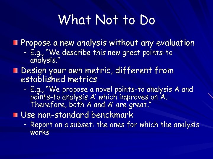 What Not to Do Propose a new analysis without any evaluation – E. g. , “We describe this new great points-to analysis. ” Design your own metric, different from established metrics – E. g. , “We propose a novel points-to analysis A and points-to analysis A’ which improves on A. Therefore, both A and A’ are great. ” Use non-standard benchmark – Report on a subset: the ones for which the analysis works