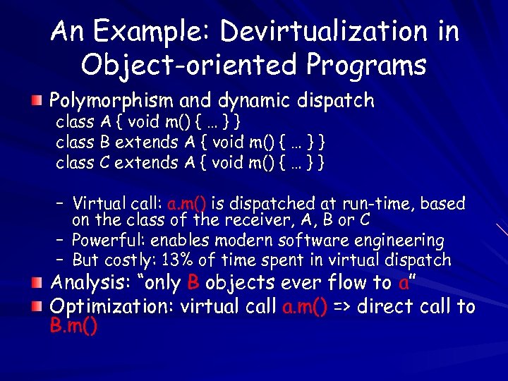 An Example: Devirtualization in Object-oriented Programs Polymorphism and dynamic dispatch class A { void m() { … } } class B extends A { void m() { … } } class C extends A { void m() { … } } – Virtual call: a. m() is dispatched at run-time, based on the class of the receiver, A, B or C – Powerful: enables modern software engineering – But costly: 13% of time spent in virtual dispatch Analysis: “only B objects ever flow to a” Optimization: virtual call a. m() => direct call to B. m()