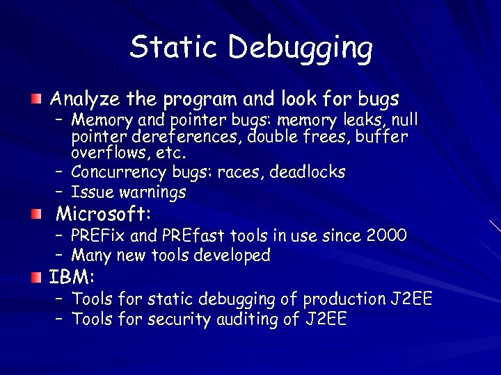 Static Debugging Analyze the program and look for bugs – Memory and pointer bugs: memory leaks, null pointer dereferences, double frees, buffer overflows, etc. – Concurrency bugs: races, deadlocks – Issue warnings Microsoft: – PREFix and PREfast tools in use since 2000 – Many new tools developed IBM: – Tools for static debugging of production J 2 EE – Tools for security auditing of J 2 EE