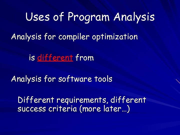 Uses of Program Analysis for compiler optimization is different from Analysis for software tools Different requirements, different success criteria (more later…)