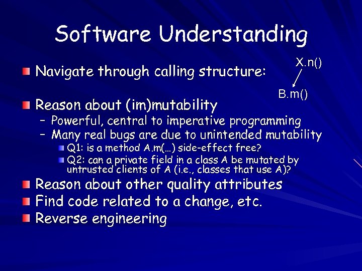 Software Understanding X. n() Navigate through calling structure: Reason about (im)mutability B. m() – Powerful, central to imperative programming – Many real bugs are due to unintended mutability Q 1: is a method A. m(…) side-effect free? Q 2: can a private field in a class A be mutated by untrusted clients of A (i. e. , classes that use A)? Reason about other quality attributes Find code related to a change, etc. Reverse engineering