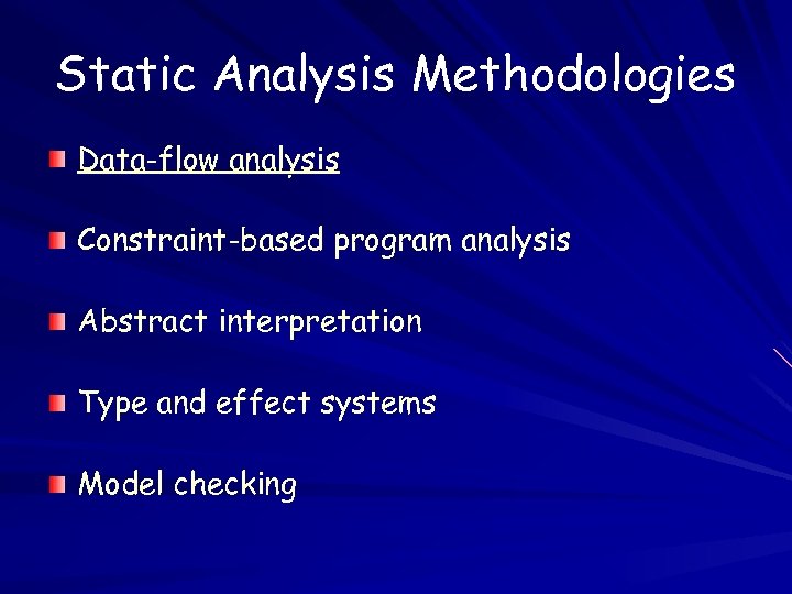 Static Analysis Methodologies Data-flow analysis Constraint-based program analysis Abstract interpretation Type and effect systems Model checking