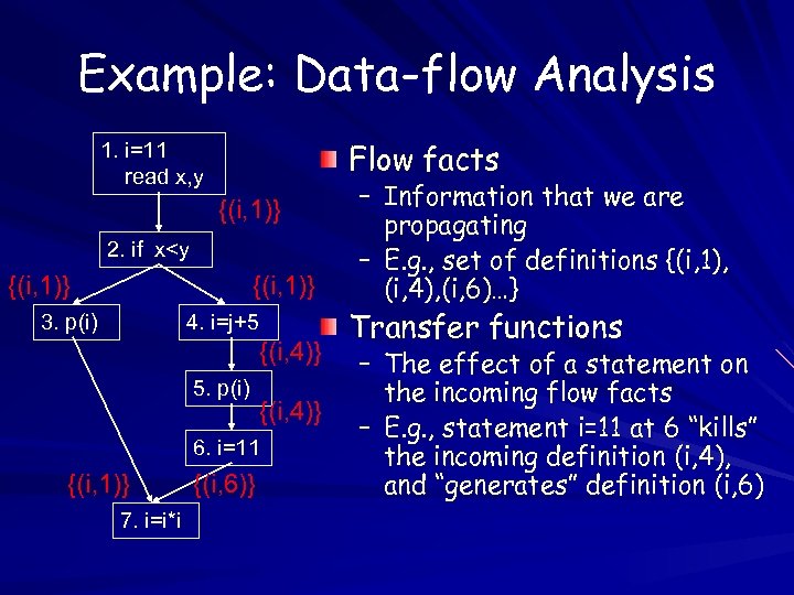 Example: Data-flow Analysis Flow facts 1. i=11 read x, y {(i, 1)} 2. if x<y {(i, 1)} 3. p(i) 4. i=j+5 {(i, 4)} 5. p(i) {(i, 4)} 6. i=11 {(i, 1)} 7. i=i*i {(i, 6)} – Information that we are propagating – E. g. , set of definitions {(i, 1), (i, 4), (i, 6)…} Transfer functions – The effect of a statement on the incoming flow facts – E. g. , statement i=11 at 6 “kills” the incoming definition (i, 4), and “generates” definition (i, 6)