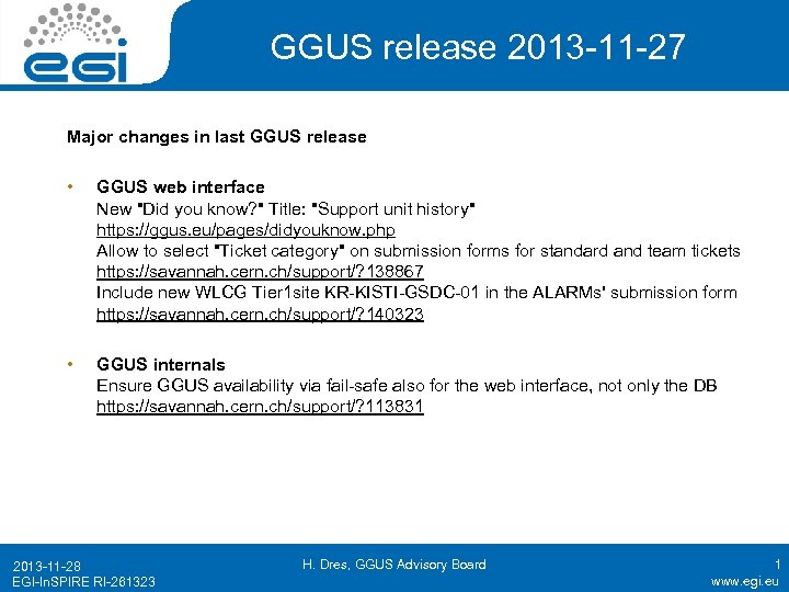 GGUS release 2013 -11 -27 Major changes in last GGUS release • GGUS web interface New "Did you know? " Title: "Support unit history" https: //ggus. eu/pages/didyouknow. php Allow to select "Ticket category" on submission forms for standard and team tickets https: //savannah. cern. ch/support/? 138867 Include new WLCG Tier 1 site KR-KISTI-GSDC-01 in the ALARMs' submission form https: //savannah. cern. ch/support/? 140323 • GGUS internals Ensure GGUS availability via fail-safe also for the web interface, not only the DB https: //savannah. cern. ch/support/? 113831 2013 -11 -28 EGI-In. SPIRE RI-261323 H. Dres, GGUS Advisory Board 1 www. egi. eu
