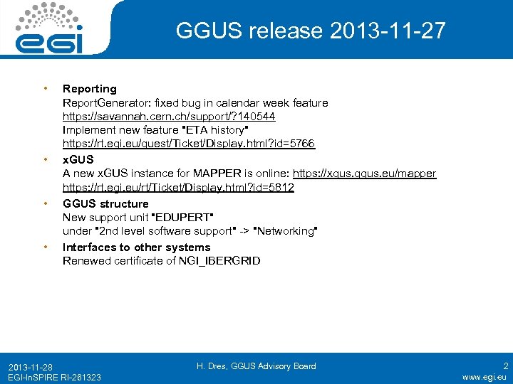 GGUS release 2013 -11 -27 • • Reporting Report. Generator: fixed bug in calendar week feature https: //savannah. cern. ch/support/? 140544 Implement new feature "ETA history" https: //rt. egi. eu/guest/Ticket/Display. html? id=5766 x. GUS A new x. GUS instance for MAPPER is online: https: //xgus. ggus. eu/mapper https: //rt. egi. eu/rt/Ticket/Display. html? id=5812 GGUS structure New support unit "EDUPERT" under "2 nd level software support" -> "Networking" Interfaces to other systems Renewed certificate of NGI_IBERGRID 2013 -11 -28 EGI-In. SPIRE RI-261323 H. Dres, GGUS Advisory Board 2 www. egi. eu