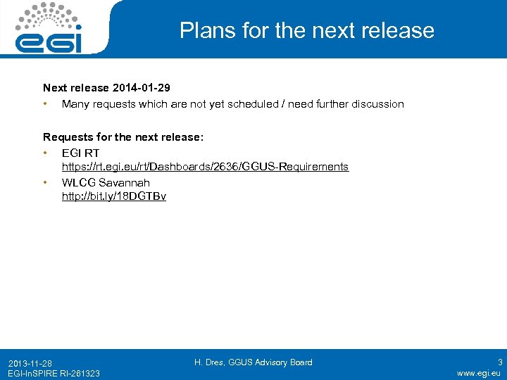Plans for the next release Next release 2014 -01 -29 • Many requests which are not yet scheduled / need further discussion Requests for the next release: • EGI RT https: //rt. egi. eu/rt/Dashboards/2636/GGUS-Requirements • WLCG Savannah http: //bit. ly/18 DGTBv 2013 -11 -28 EGI-In. SPIRE RI-261323 H. Dres, GGUS Advisory Board 3 www. egi. eu