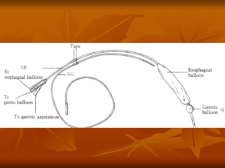 n n Compression of varices for not excess 48 hours Deflate the esophageal balloon for about 30 mins every 12 hours Major complications -- aspiration and esophageal perforation Control hemorrhage >90%, but it is temporary