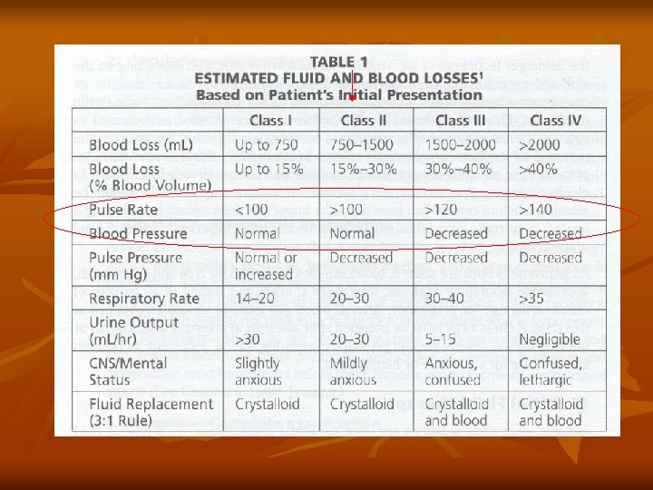 hemodynamics Blood loss(% of intravascular volume) Severity of bleeding normal < 10 minor Orthostatic hypotension or tachycardia 10 -20 moderate shock 20 -25 massive