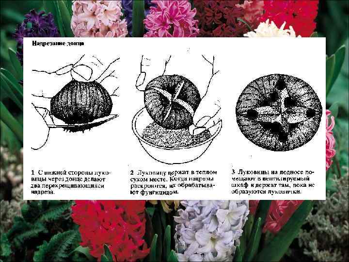 Надрезание донца. Гиацинты можно размножать быстрее, если воспользоваться методом, напоминающим предыдущий. Единственное отличие состоит в том, что вместо вырезания донца на нижней части луковицы делают лишь несколько надрезов глубиной до 0, 6 см. На крупной луковице делают обычно 4 надреза под прямым углом друг к другу (два пересекающихся крестообразных), а на более мелких достаточно сделать 2 надреза. В этом случае число образующихся луковичек уменьшается, но они бывают крупнее. Луковицы гиацинтов предварительно дезинфицируют так же, как и при вырезании донца. Надрезанные луковицы помещают на день в сухое теплое место (+21 °С): в этих условиях надрезы лучше раскрываются. Когда надрезы раскроются, их обрабатывают фунги-цидом. Последующие операции и условия хранения луковиц те же, что и в предыдущем методе. В результате образуются луковички в количестве 8— 15 штук, для доращивания которых потребуется 2— 3 года.