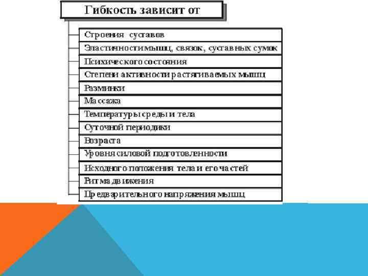На гибкость существенно влияют внешние условия: 1) время суток 2) температура воздуха 3) проведена ли разминка 4) разогрето ли тело