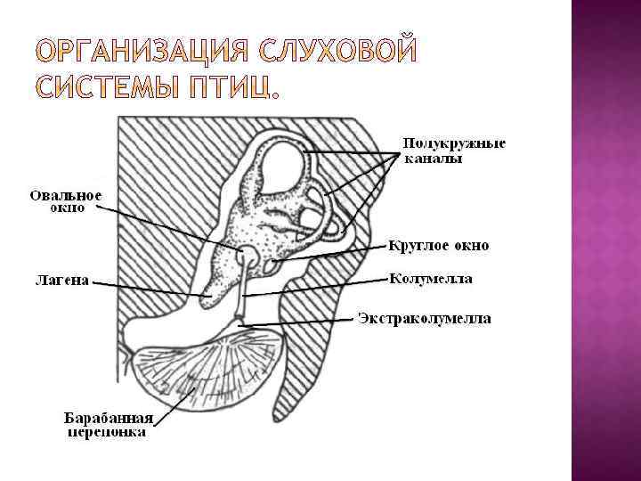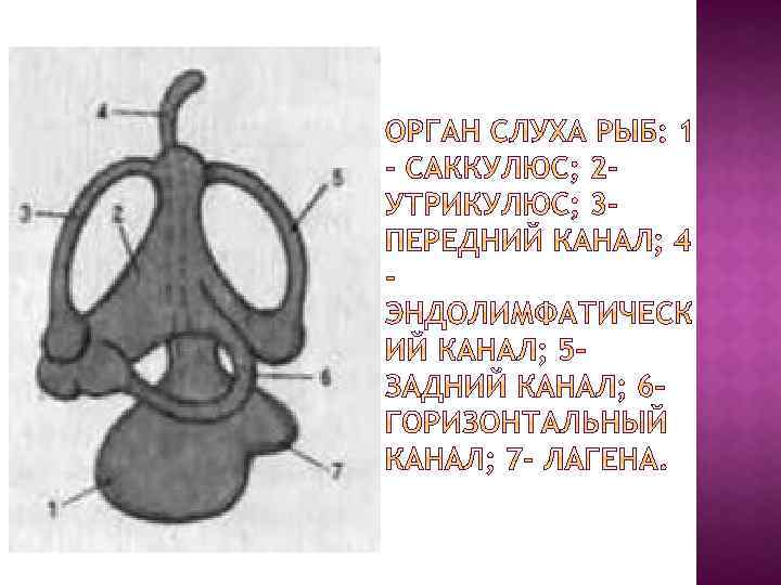 А — рыбы; Б — черепахи; В — птицы; Г — млекопитающего; 1 — утрикулюс; 2 — саккулюс; 3 — лагена; 4 — слуховой сосочек; 5 — основная мембрана; 6 — улитка.
