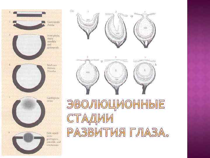 Развитие глаза беспозвоночных (на примере гидромедуз). Слева вверху — глазное пятно; слева внизу — глазная ямка; справа — глазной пузырь. 1 — зрительная клетка; 2 — пигментная клетка; 3 — зрительный нерв; 4 — эпителий; 5 — хрусталик; 6 — светочувствительные палочки; 7–стекловидное тело (по