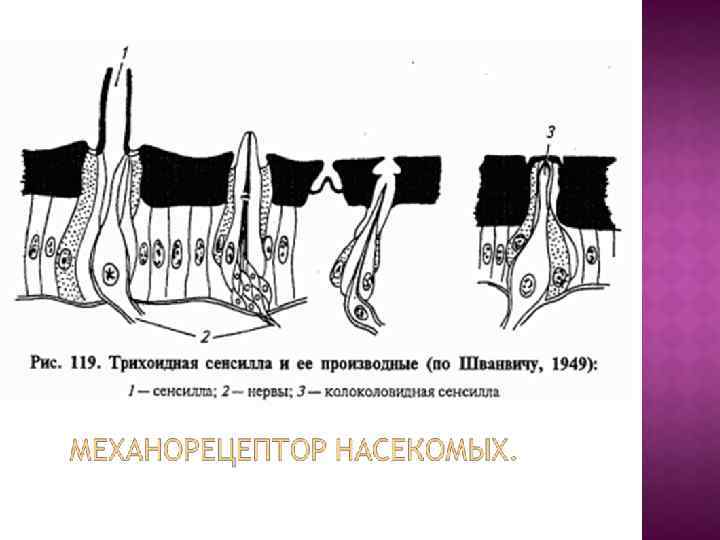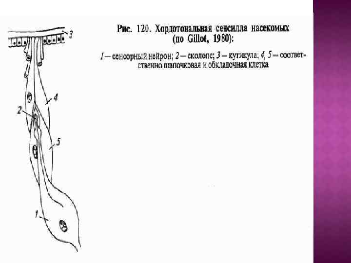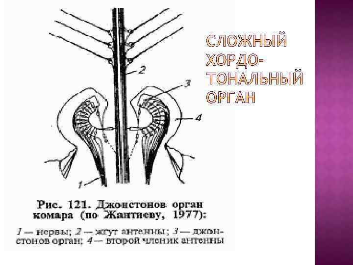 Джонстонов орган комара А — общий вид антенн самца комара; Б — организация джонстонова органа комаров семейства Culicidae: 1 — жгутик, 2 — волосок жгутика, 3 — хордотональная сенсилла, 4 — антеннальный нерв, 5 — нерв джонстонова органа, в — базальная пластинка (отросток III членика антенны); I, II — первый и второй членики антенны.