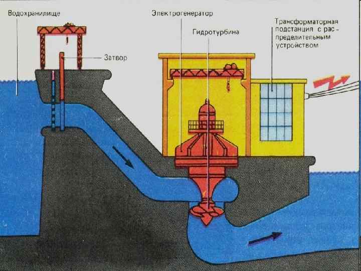 Принцип работы Имеется водохранилище. Оттуда вода, пропускаемая затвором, с высокой скоростью и под большим углом стекает вниз. Там она раскручивает лопасти гидротурбины, теряя часть своей энергии, впадая в реку. Тем временем в электрогенераторе энергия, приобретенная лопастями гидротурбины, переходит в трансформаторную подстанцию с распределительным устройством.