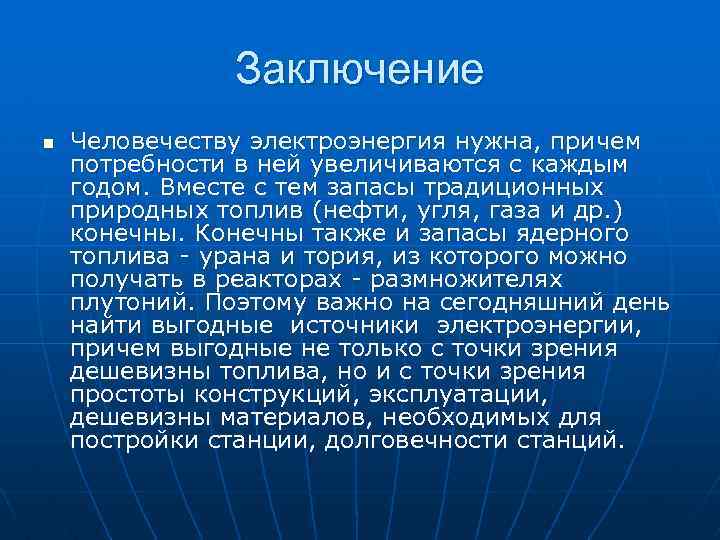 Заключение n Человечеству электроэнергия нужна, причем потребности в ней увеличиваются с каждым годом. Вместе с тем запасы традиционных природных топлив (нефти, угля, газа и др. ) конечны. Конечны также и запасы ядерного топлива урана и тория, из которого можно получать в реакторах размножителях плутоний. Поэтому важно на сегодняшний день найти выгодные источники электроэнергии, причем выгодные не только с точки зрения дешевизны топлива, но и с точки зрения простоты конструкций, эксплуатации, дешевизны материалов, необходимых для постройки станции, долговечности станций.