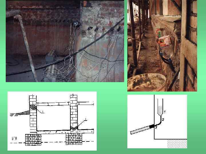 Гидроизоляция подвальных помещений 1. • 1 - Типы гидроизоляции • 2. • • • а – наружная противонапорная; б – внутренняя противонапорная; в- гидроизоляция водонапорная; д – гидроизоляция лотковой формы внутренних помещений; е – защита от капилярной влаги. 2 - подвальные помещения при различных уровнях напора подземных вод