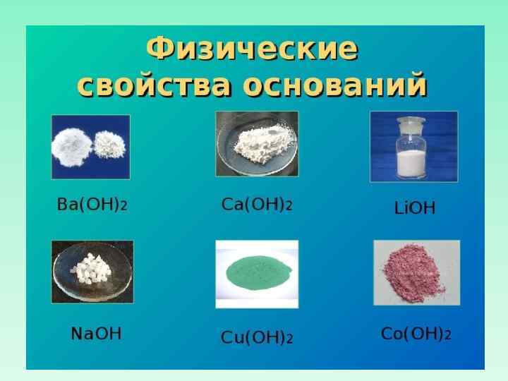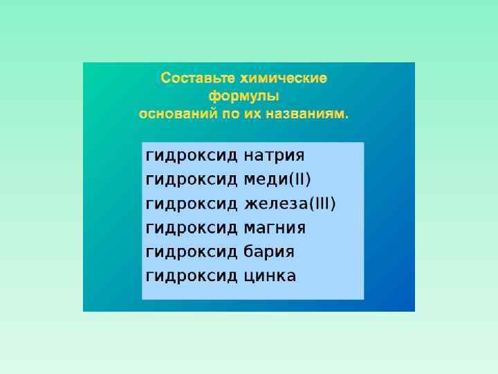 Основания Растворимые в воде Щелочи КОН Li. OH Na. OH Ca(ОН)2 Нерастворимые в воде Fe(OH)2 Cu(OH)2 Mg(ОН)2