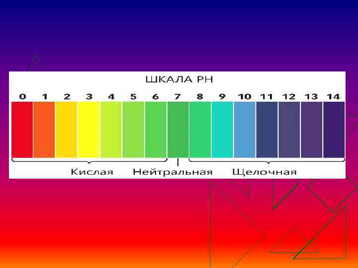 Изменение цвета различных индикаторов при действии растворов кислот и щелочей Индикатор Цвет индикатора в среде кислой Лакмус Красный щелочной Синий Фенолфта- Бесцветный Малиновый леин нейтрально й —— Бесцветный